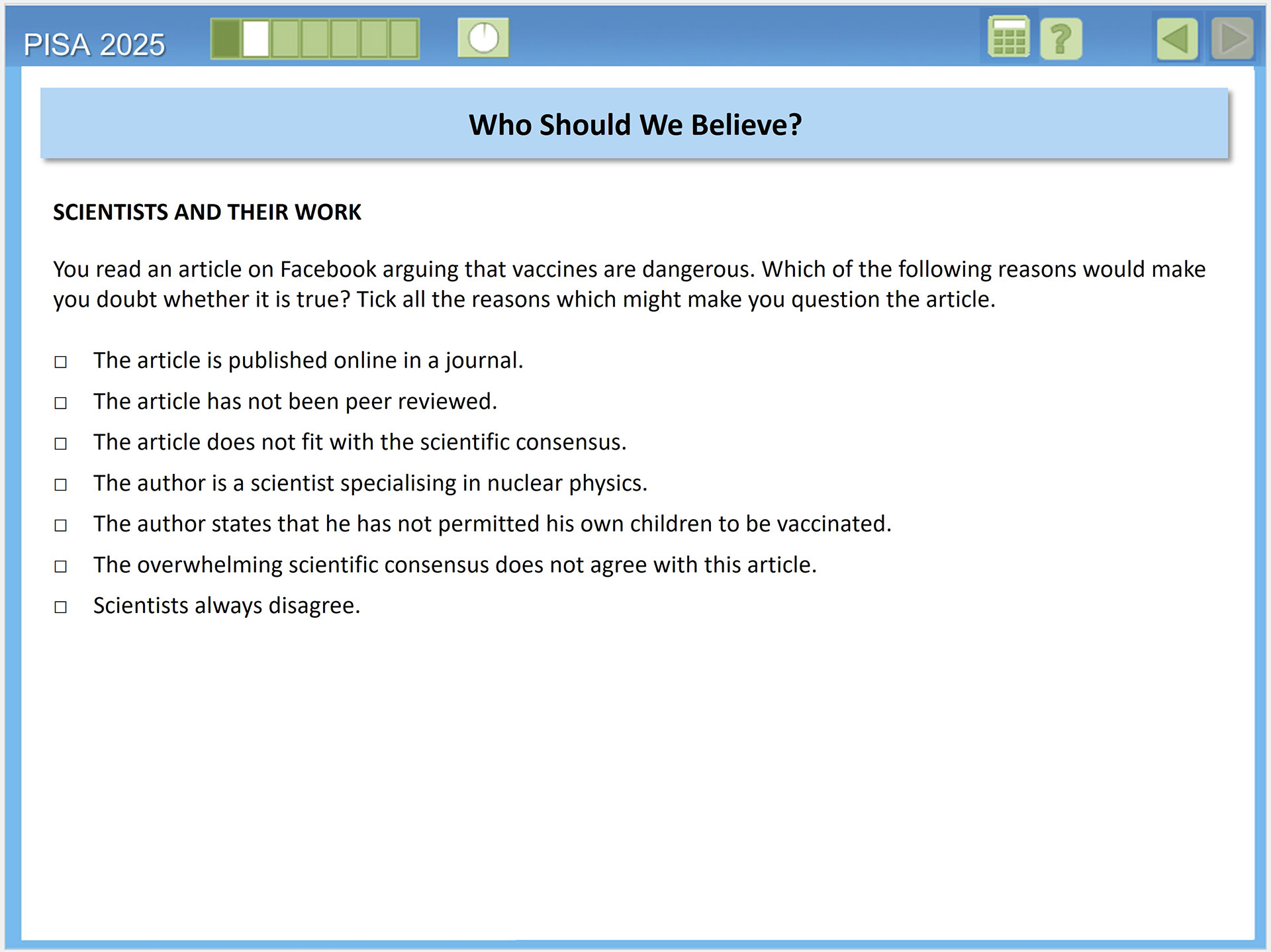 The PISA 2025 assessment measures how well countries are preparing their students with an understanding of science and how science produces reliable knowledge. This is crucial for citizens who need to make informed personal decisions about science-related phenomena such as health and the environment to engage in action within their families, local communities, and wider societies. It is particularly important in the 21st century when humanity faces an uncertain future as it enters the Anthropocene, an era in which human impact is significantly changing Earth’s systems. A knowledge of science then matters at the individual, regional and global levels as we seek to address these impacts.