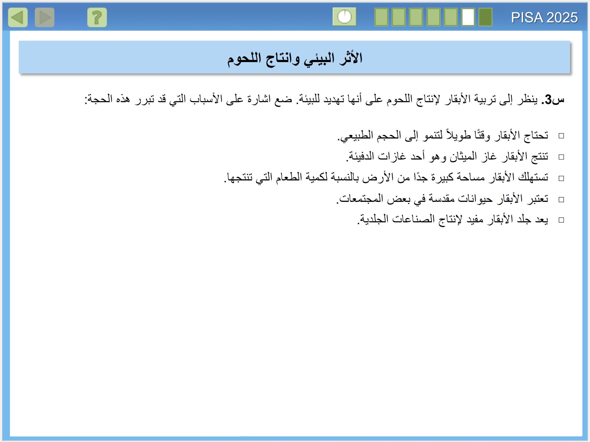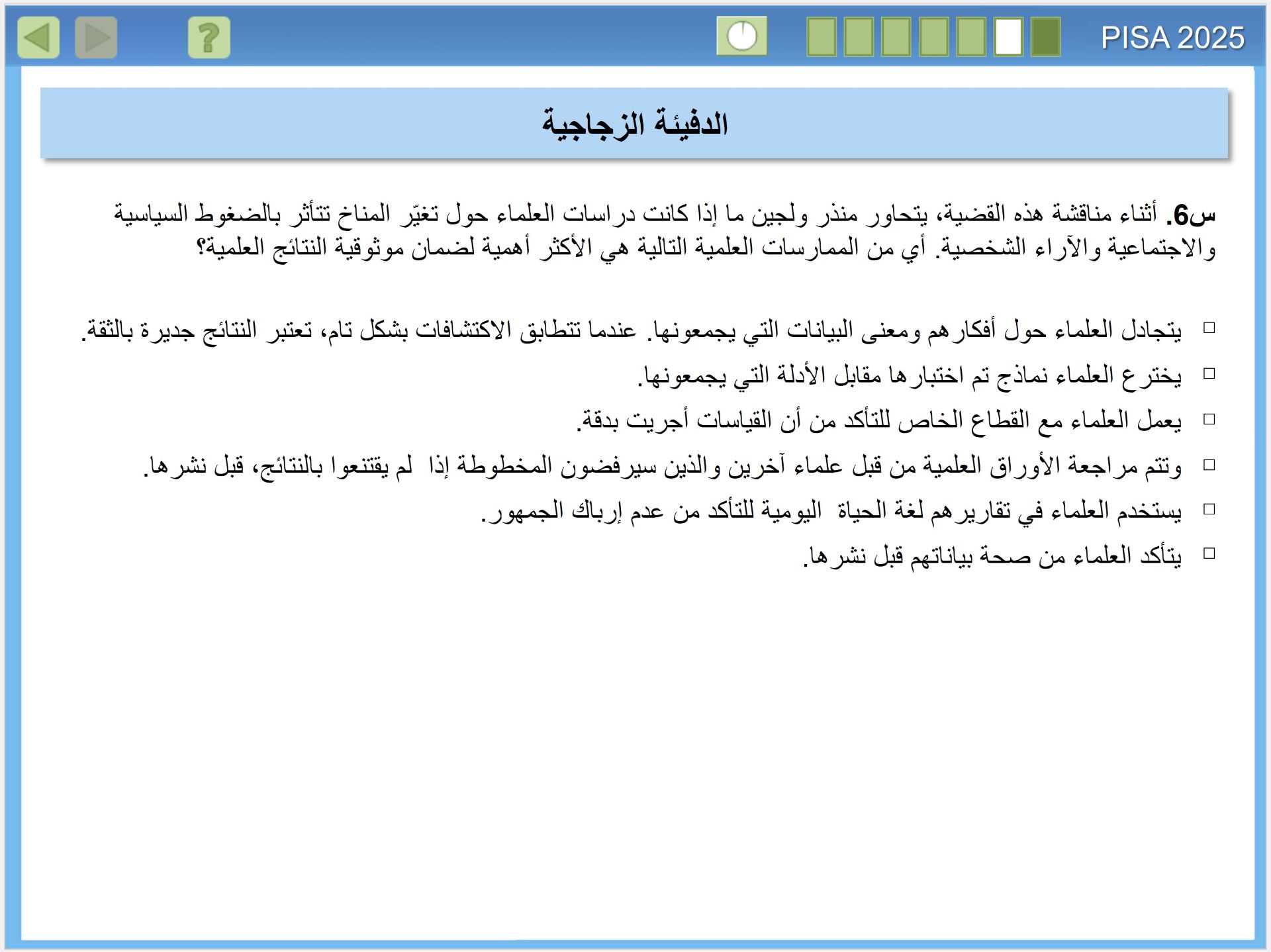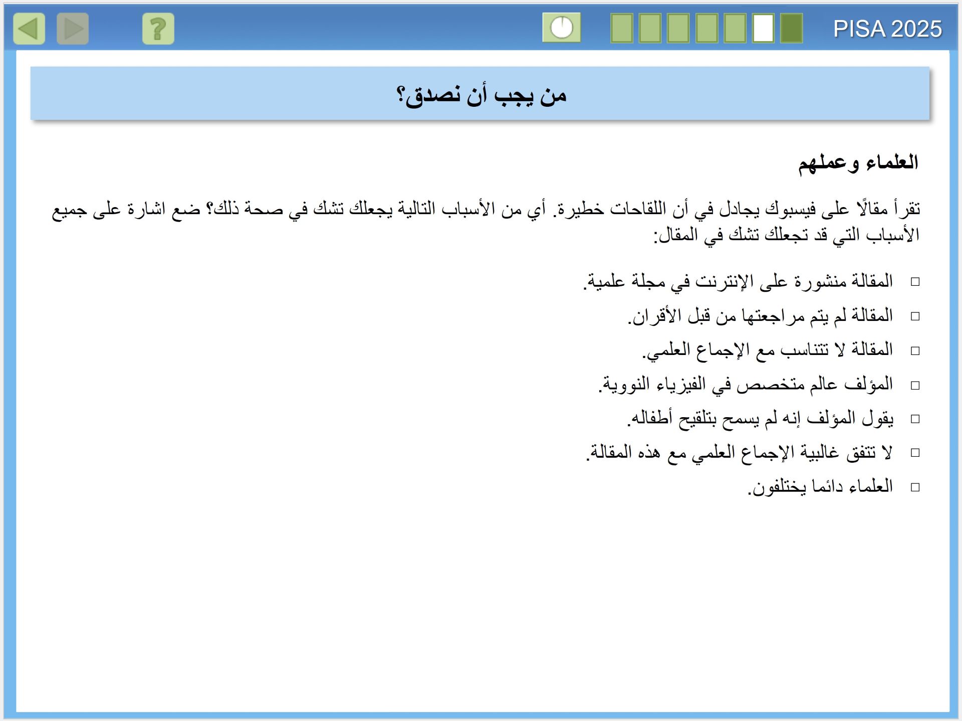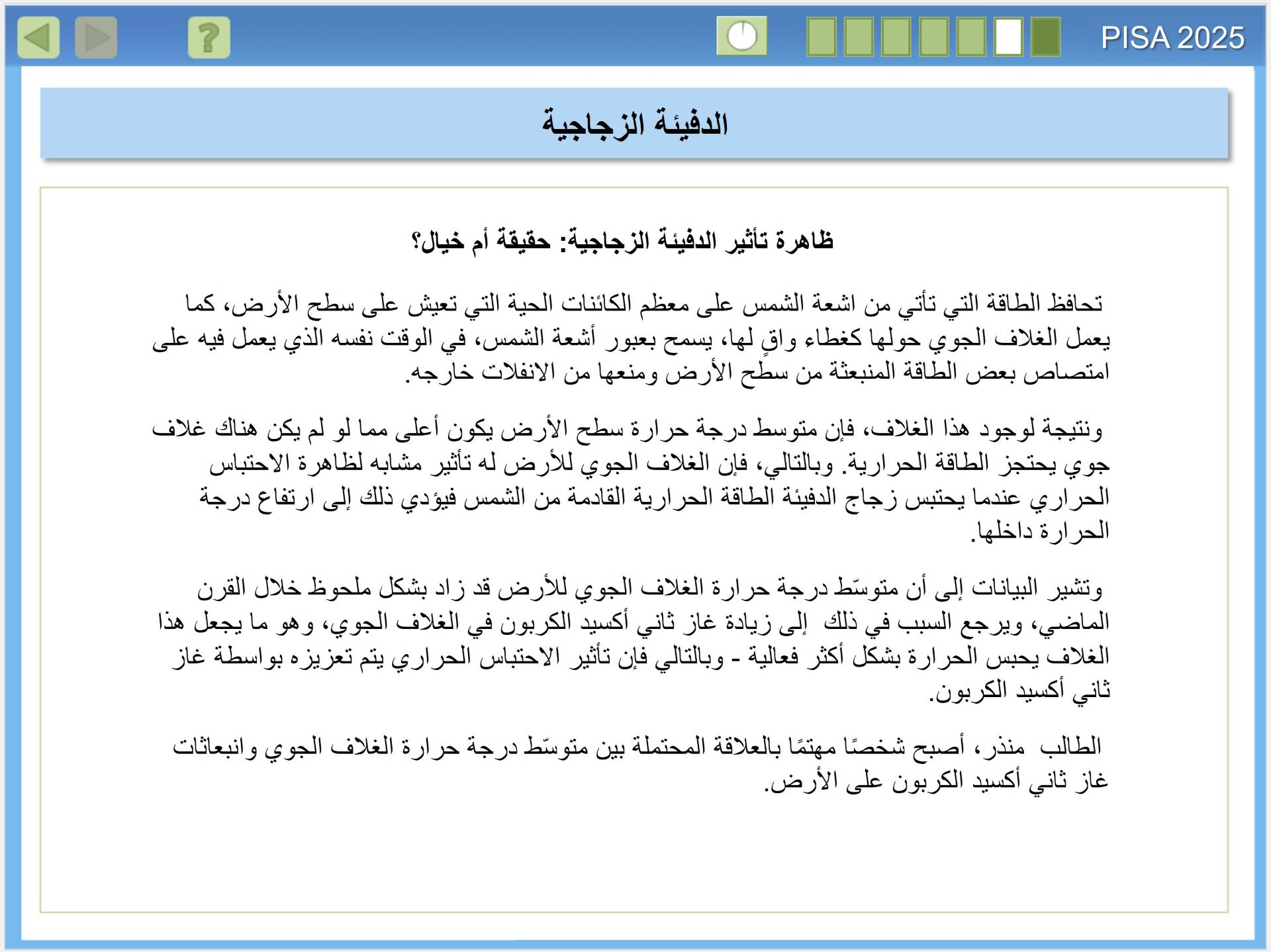 يقيس تقييم بيزا 2025 مدى الجودة في إعداد الطلبة في البلدان لفهم العلوم، وكيف ينتج العلم معرفة موثوقة. وهذا الأمر على درجة كبيرة من الأهمية، للمواطنين الذين يحتاجون اتخاذ قرارات شخصية مستنيرة، بشأن الظواهر المتعلقة بالعلوم مثل: الصحة والبيئة، للانخراط في العمل داخل أسرهم والمجتمعات المحلية والمجتمعات الأوسع، إنه مهم بشكل خاص في القرن الحادي والعشرين، عندما تواجه البشرية مستقبلًا مجهولا، في الوقت الذي تدخل فيه عصر الأنثروبوسين (Anthropocene)، وهو عصر يُحدث فيه الإنسان تأثيرا كبيرا في تغيير أنظمة الأرض. ولذا فإن المعرفة بالعلوم مهمة على المستوى الفردي والمحلي والعالمي، حيث نسعى لمعالجة هذه التأثيرات.