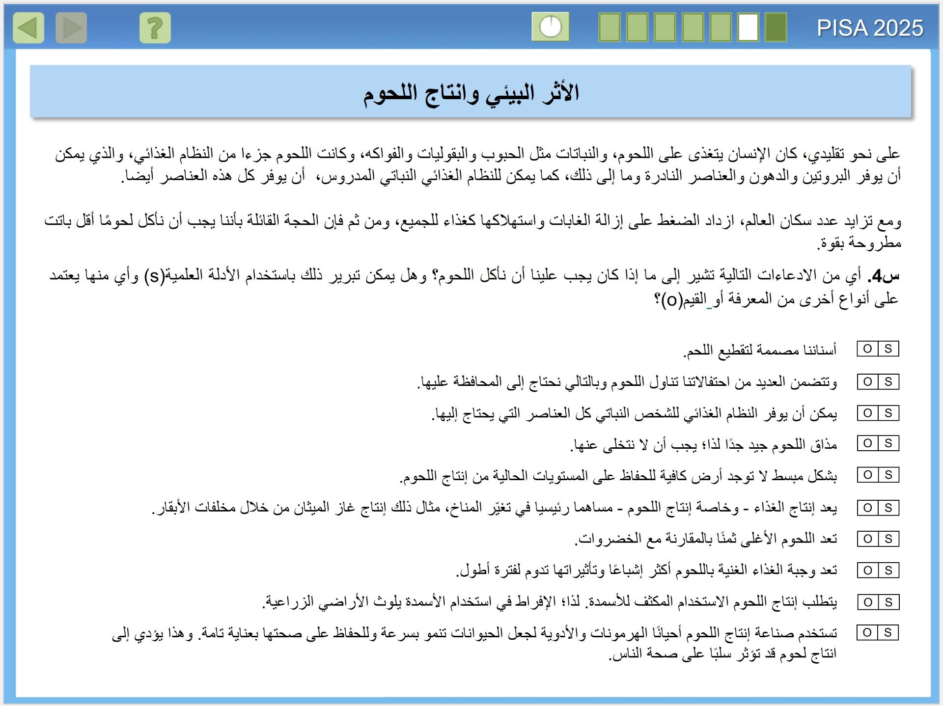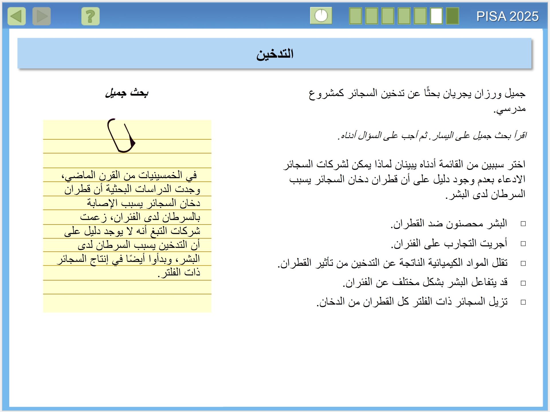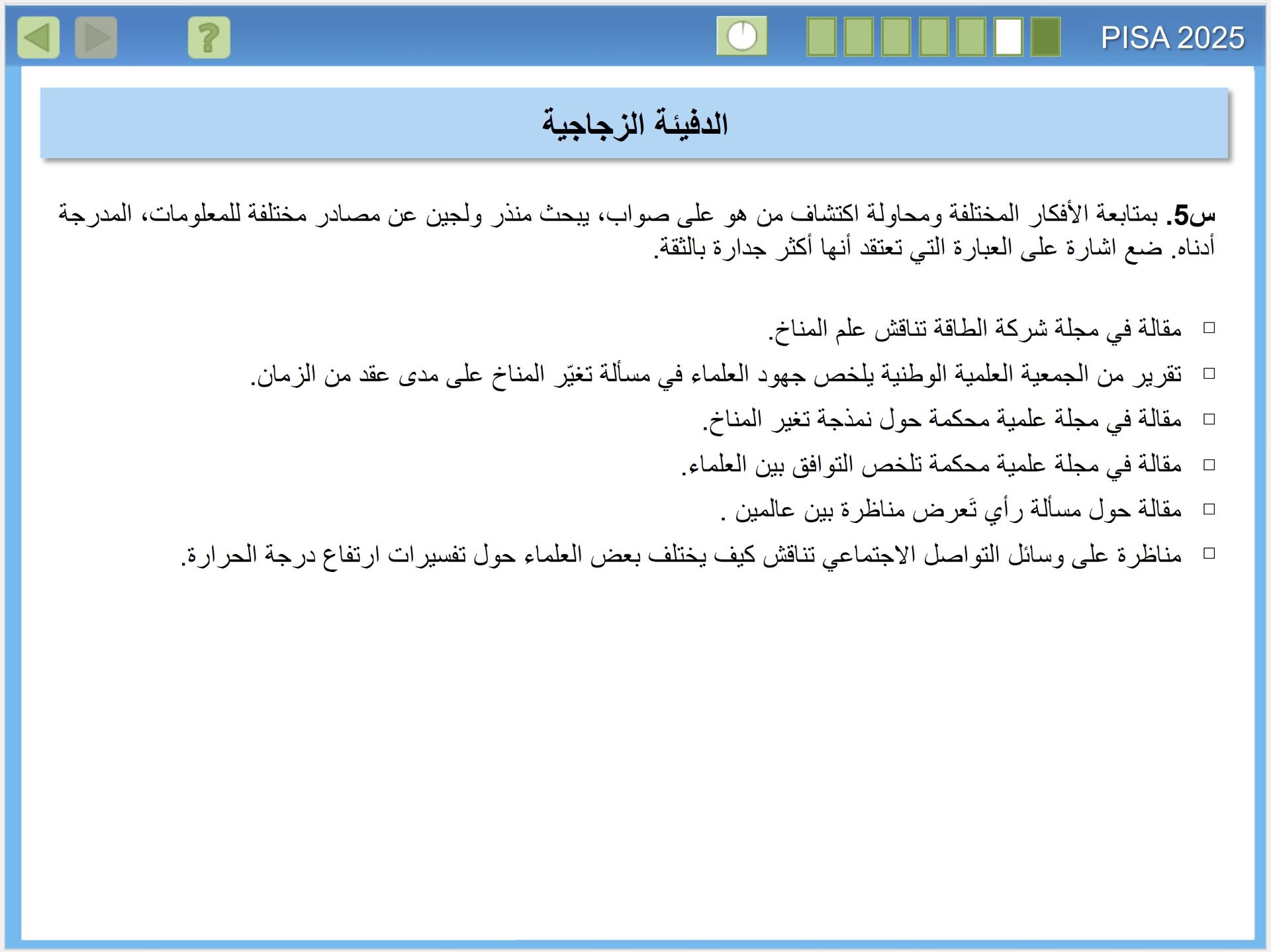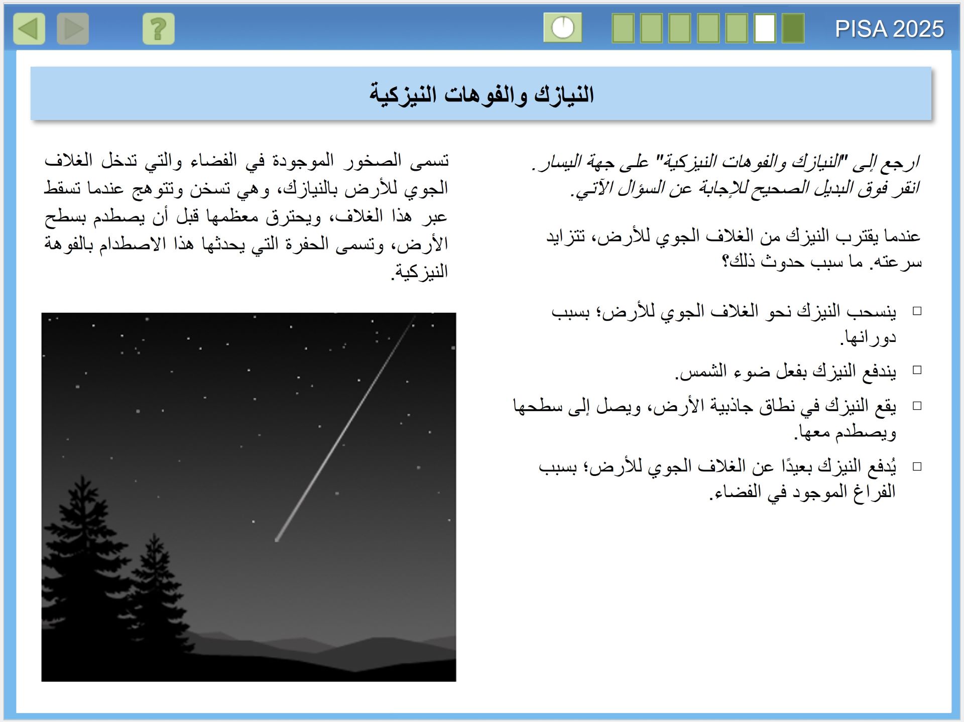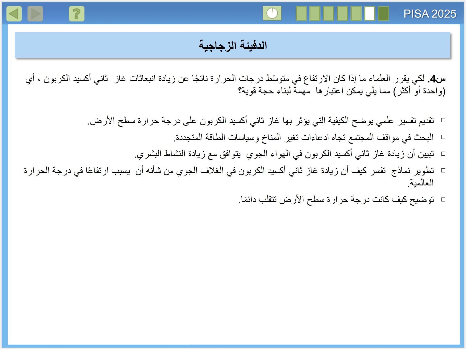 يقيس تقييم بيزا 2025 مدى الجودة في إعداد الطلبة في البلدان لفهم العلوم، وكيف ينتج العلم معرفة موثوقة. وهذا الأمر على درجة كبيرة من الأهمية، للمواطنين الذين يحتاجون اتخاذ قرارات شخصية مستنيرة، بشأن الظواهر المتعلقة بالعلوم مثل: الصحة والبيئة، للانخراط في العمل داخل أسرهم والمجتمعات المحلية والمجتمعات الأوسع، إنه مهم بشكل خاص في القرن الحادي والعشرين، عندما تواجه البشرية مستقبلًا مجهولا، في الوقت الذي تدخل فيه عصر الأنثروبوسين (Anthropocene)، وهو عصر يُحدث فيه الإنسان تأثيرا كبيرا في تغيير أنظمة الأرض. ولذا فإن المعرفة بالعلوم مهمة على المستوى الفردي والمحلي والعالمي، حيث نسعى لمعالجة هذه التأثيرات.