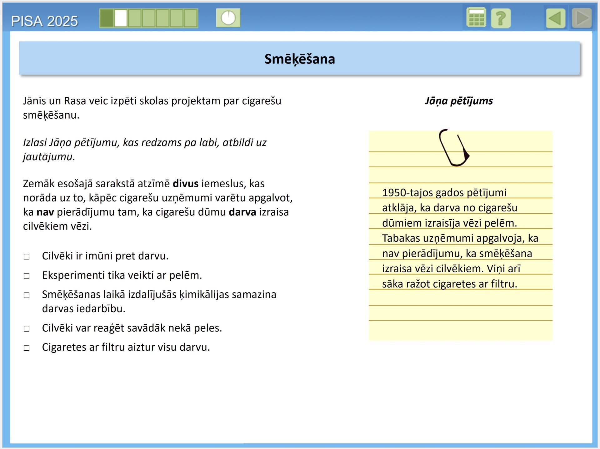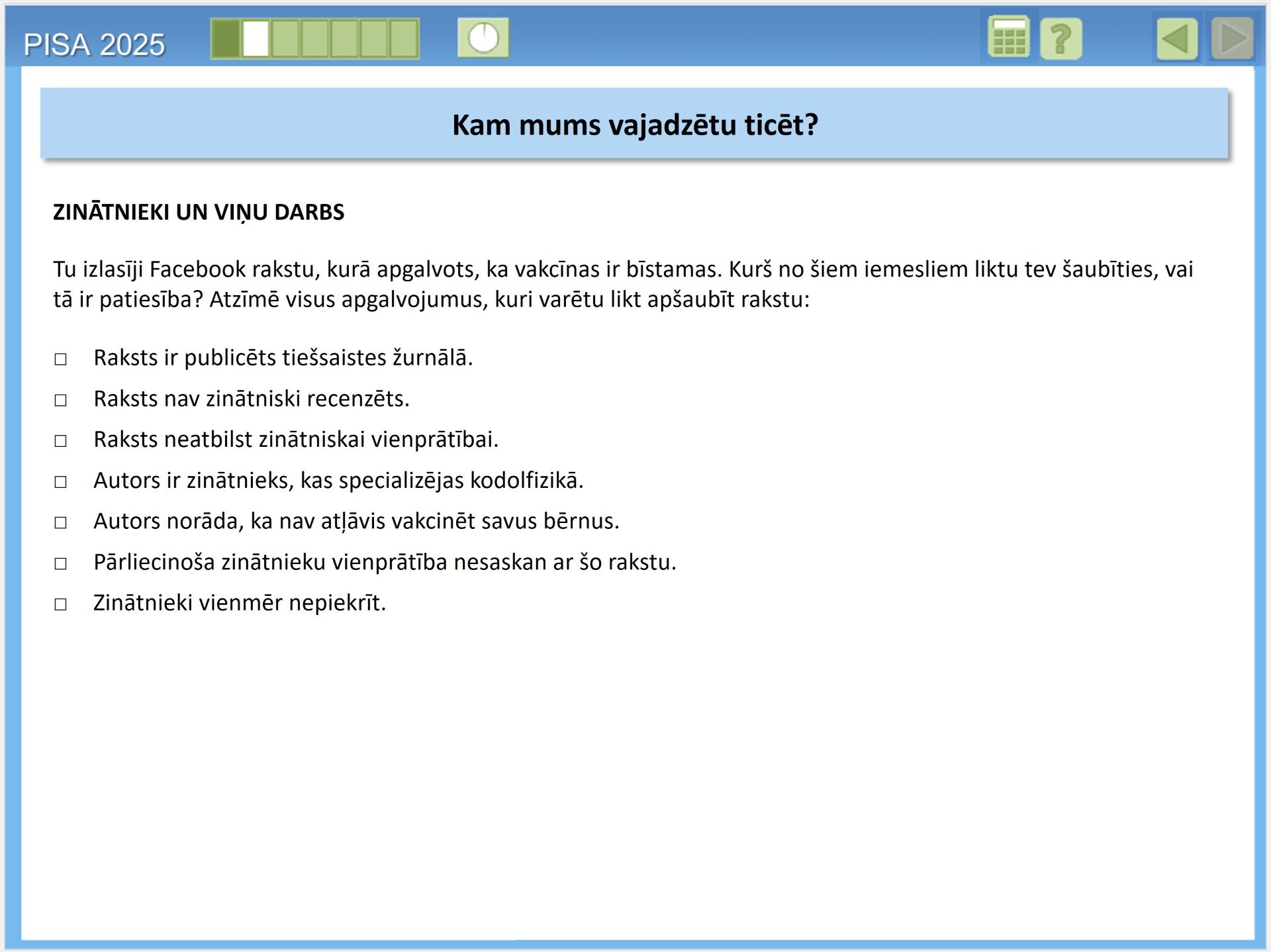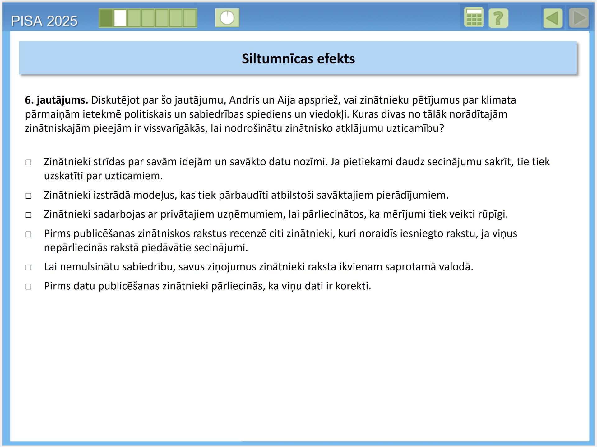 PISA 2025 pētījumā tiek novērtēts, cik labi valstis sagatavo savus skolēnus, lai viņi izprastu dabaszinātnes un to, kā dabaszinātnes rada ticamas zināšanas. Ir ļoti svarīgi, lai iedzīvotāji, kuriem jāpieņem apzināti personīgi lēmumi par tādām ar dabaszinātnēm saistītām parādībām kā veselība un vide, aktīvi diskutētu un darbotos savās ģimenēs, vietējās kopienās un plašākā sabiedrībā. Tas ir īpaši svarīgi 21. gadsimtā, kurā cilvēce saskaras ar neskaidru nākotni, ieejot laikmetā, kurā cilvēka darbības ir būtiski mainījušas Zemes sistēmas. Šādā laikmetā dabaszinātņu zināšanām ir liela nozīme gan individuālā, gan reģionālā un globālā līmenī, jo mēs cenšamies mazināt šo ietekmi.